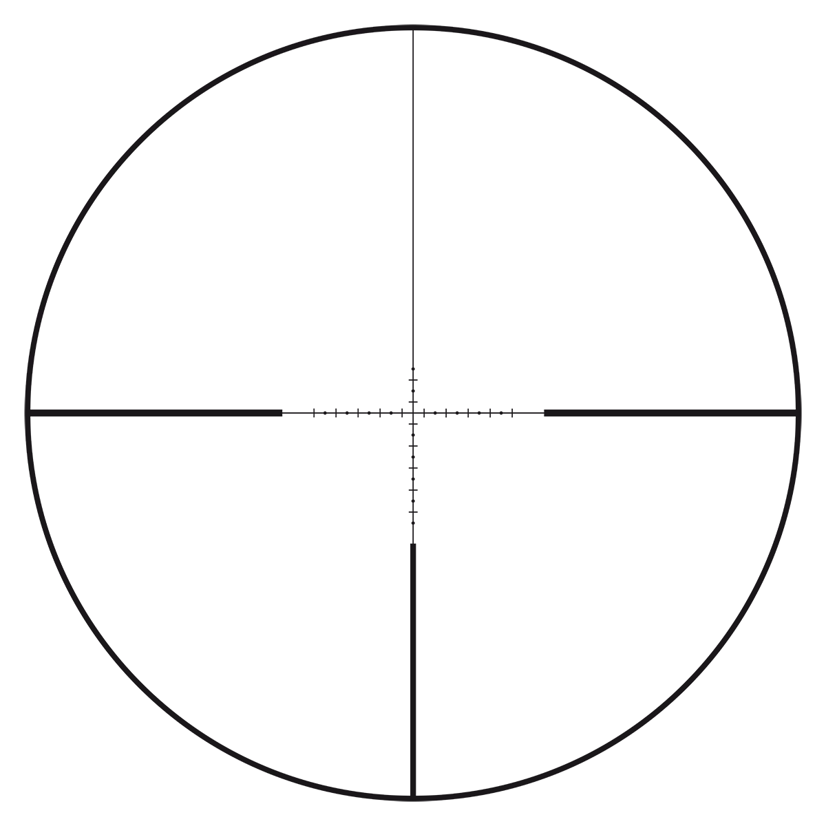 Das im Hintergrund eingestellte DSMR-Absehen verändert sich bei einer Veränderung der Vergrößerung nicht, es ändert sich lediglich die Größe des Ziels. Dadurch verdeckt der Zielpunkt beispielsweise bei einer Entfernung von 300 m nur 5,28 cm des Ziels. Das metrische Fadenkreuz mit 6-facher Vergrößerung und Unterteilungen alle 1 MRAD (10 cm/100 m) ermöglicht eine schnelle Anwendung von Höhen- und Seiten-/Ableitungskorrekturen sowie eine Schätzung der Entfernung zum Ziel.